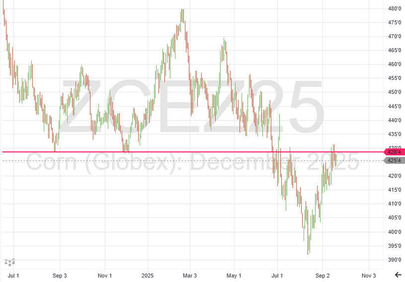 This week, December corn futures failed to push through and close above key resistance at 429. Assuming we don’t push through that resistance, look for December corn to maintain its range between 430 and 410.